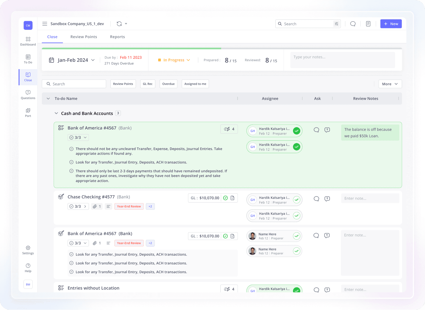 Users must switch between the Close and To-Do modules, disrupting workflow continuity.