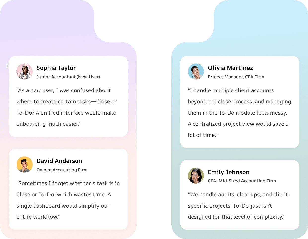 To understand the limitations of the existing To-Do module, I conducted user interviews, contextual inquiries, and usability reviews with accountants, CPAs, and firm managers. The research aimed to uncover how users manage tasks and where the To-Do module fails in real-world workflows.